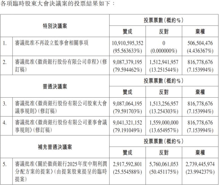 此次股东大会共审议了5项议案,包括不再设立监事会、修改公司章程、修改股东会及董事会议事规则,以及一项有关2025年中期分红的提案。投票结果显示,前四项议案均获高票通过,但中期分红提案仅获得25.55%的赞成票,反对票数则为50.45%,另有23.99%的股东弃权,因赞成票未过半数未获通过。